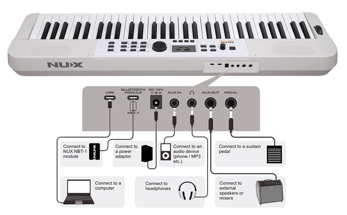 NEK-110 предлагает полную поддержку Bluetooth MIDI и Bluetooth Audio, обеспечивая безупречную интеграцию с мобильными устройствами. Благодаря USB-подключению он идеально подходит для любого сетапа на базе DAW, а выход для наушников, аудиовход/выход и разъём для педали сустейн позволяют адаптировать его к любой конфигурации — независимо от того, репетируете ли вы дома, записываетесь в студии или выступаете на сцене.