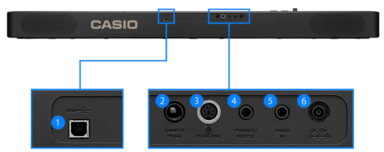 Разъемы: PHONES / OUTPUT: 1 (стерео мини джек), разъем для педали: 1 (демпфер), разъем для 3-педального блока: (SP-34, CS-470P), разъем AUDIO IN, USB типа B