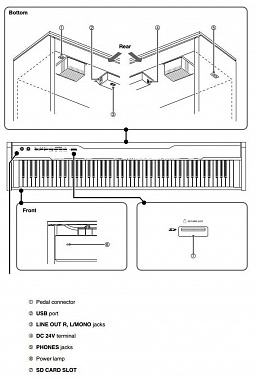разъёмы: 2 для наушников, для педали (damper), подключение для блока 3х педалей, USB, SD card, Line OUT: 2 (L / MONO, R; standard)