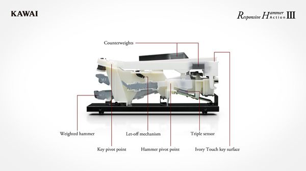Новая механика Responsive Hammer III (RHIII) воссоздает характерные ощущения от нажатия клавиш, как у настоящего акустического рояля. Очень естественный ход клавиатуры и технология с использованием трех сенсоров высокой точности обеспечивает прекрасную отзывчивость инструмента для динамичного и реалистичного исполнения. Градиент тяжести клавиатуры отражает распределение веса молоточков акустического фортепиано: клавиши нижних октав требуют большего усилия при нажатии, а клавиши верхних – меньшего, в то время как конструктивное усиление механики повышает стабильность при исполнении фортиссимо и стаккато.