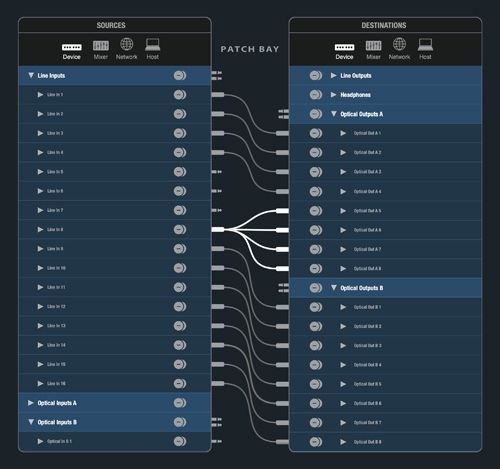 Используя интуитивно понятные виртуальные патчбей корды, вы можете легко маршрутизировать сигнал любого источника в любое место назначения. Источниками могут быть аналоговые или цифровые входы интерфейса, каналы компьютера, выходы шины микшера или аудиопотоки с других устройств в сети. Назначения включают в себя выходы интерфейсов, входы программного хоста, входы микшера или любое другое устройство (или компьютер) в сети. Вы даже можете разделить любой источник (или стереопару) на неограниченное количество выходных устройств.