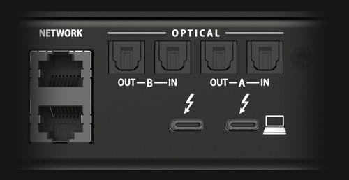 • Два банка оптических I/O — подключайте внешние цифровые процессоры, цифровые микшеры или другое оборудование с 16 каналами ADAT на частоте 44,1/48 кГц или 8 каналами S/MUX на частоте 88,2/96 кГц. Банк A может опционально предоставлять стереовход/выход TOSLink (оптический S/PDIF) до 96 кГц